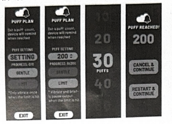 GENTLE: Vibrates twice when preset puff limit is reached. No Pop-up reminder and norestriction on output. Cycles until the puff limit is canceled.